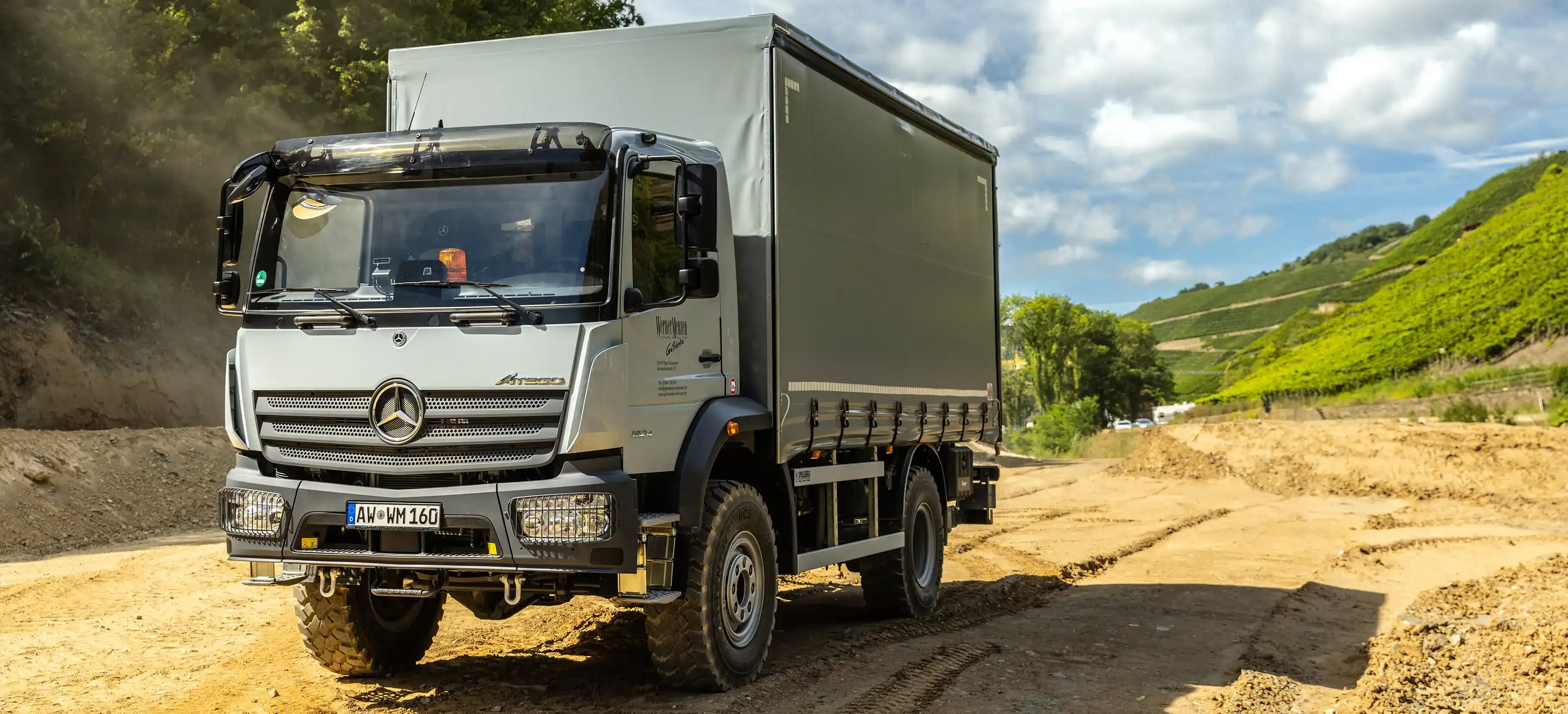 Mit unserem geländegängigen ATEGO 4x4 transportieren wir Paletten und bewegliche Güter sicher und zuverlässig – auch auf schwierigem Terrain.
